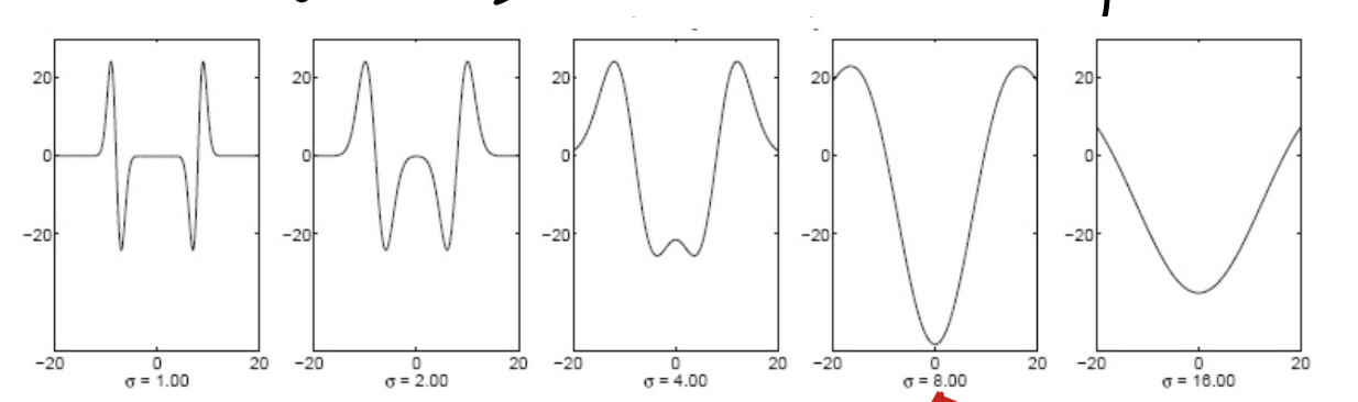 LoG convolved signal을 봤을때 falling edge에서는 rising edge에서랑 대칭된 response가 나온다는걸 볼 수 있다. 여기서 blob의 사이즈가 작아질때 response 두개가 superpose 하게 되고, blob의 center에서 response가 가장 크다라는 것을 볼 수 있다.
