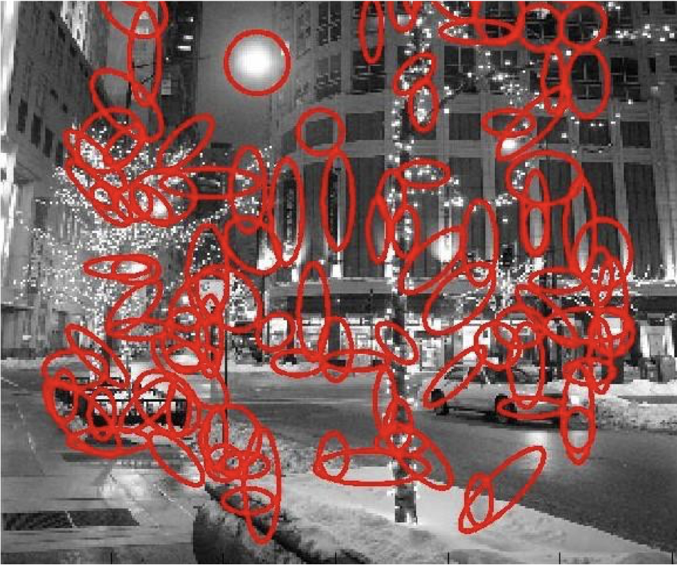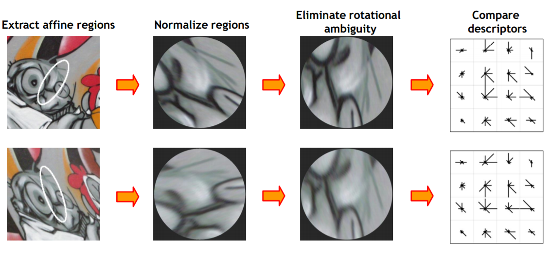 지금까지는 blob에 radius를 추가하여 scale invariant한 feature point들을 찾았다. 하지만 카메라가 찍는 각도가 달라진다면 affine transformation이 일어나고 blob이 원으로 한정되어 있다면 올바른 feature point를 찾아 matching 하는게 불가능하다. 따라서 원을 affine normalization을 해주면 원이 타원으로 바뀌게 된다. 이때 타원의 모양은 second moment matrix로 찾을 수 있다. Second moment matrix의 eigenvalue들이 타원의 장축과 단축이 되고, eigenvector가 uv space의 basis를 회전시켜 돌아간 타원을 만든다 (Harris corner detection 포스팅 참고).