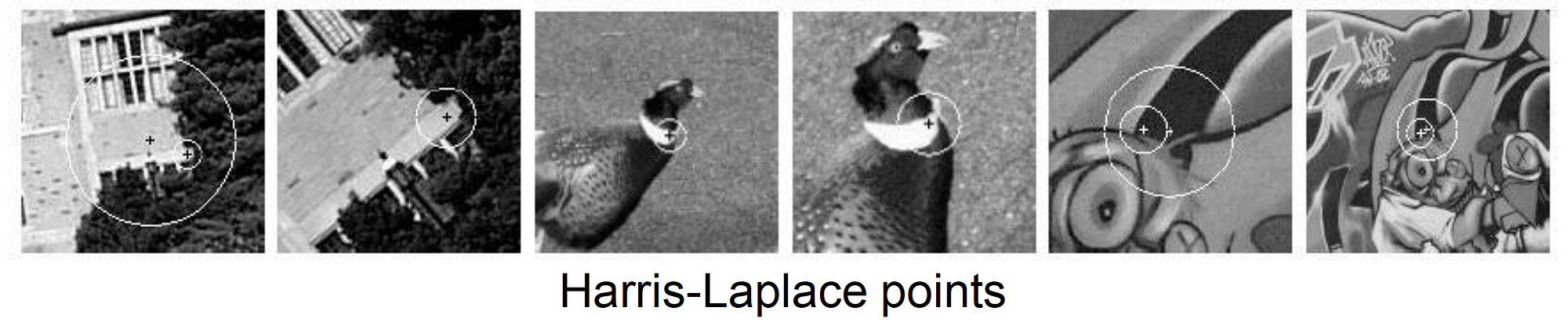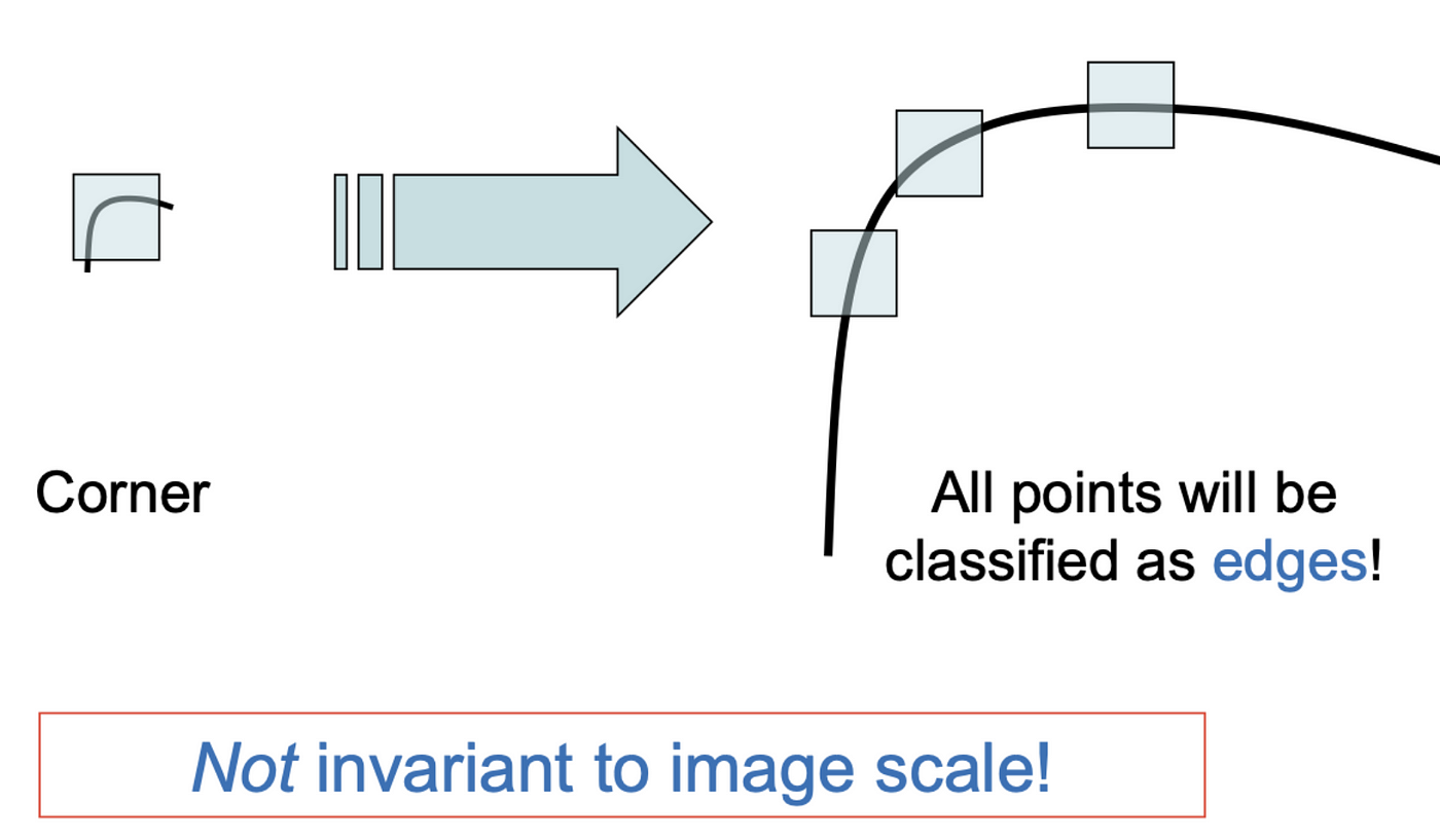 지금까지는 blob을 감지하고 알맞은 scale (radius) 를 계산하여 feature point를 찾았지만 blob 말고도 corner를 검출하고 여기에 scale을 넣어줄 수도 있다. 저번과 마찬가지로 Harris corner detection을 하고 추출된 feature point들을 각각 다른 sigma로 convolve 된 이미지들을 찾는다. 이 이미지들로 DoG를 사용해서 maximum 이 되는 optimal sigma를 찾으면 $ \sigma_{opt} = \frac{r}{\sqrt{2}}$ 를 써서 scale 을 구할 수 있다. 원래 Harris corner detection은 scale invariant 하지 않지만 scale 을 추가해준다면 확대를 해도 그만큼의 scale의 변화가 있기 때문에 scale invariant 하다.