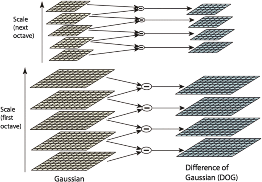LoG 보다 계산을 조금 더 효율적으로 하기 위해 DoG를 사용한다. LoG 에서는 $ LoG = \sigma^2 (G_{xx}(x,y,\sigma) + G_{yy}(x,y,\sigma))$ 이었지만 이 함수를 $ DoG = G(x,y,k\sigma) - G(x,y,\sigma)$ 로 approximate 할 수 있다. 이러한 방식을 DoG라고 한다. 이때 k는 임의로 정할 수 있는 상수이다. 따라서 이미지를 다른 sigma 값들로 gaussian blurring 처리한 후, 처리된 이미지 두개의 intensity 차이를 구하면 LoG 를 approximate 할 수 있다.