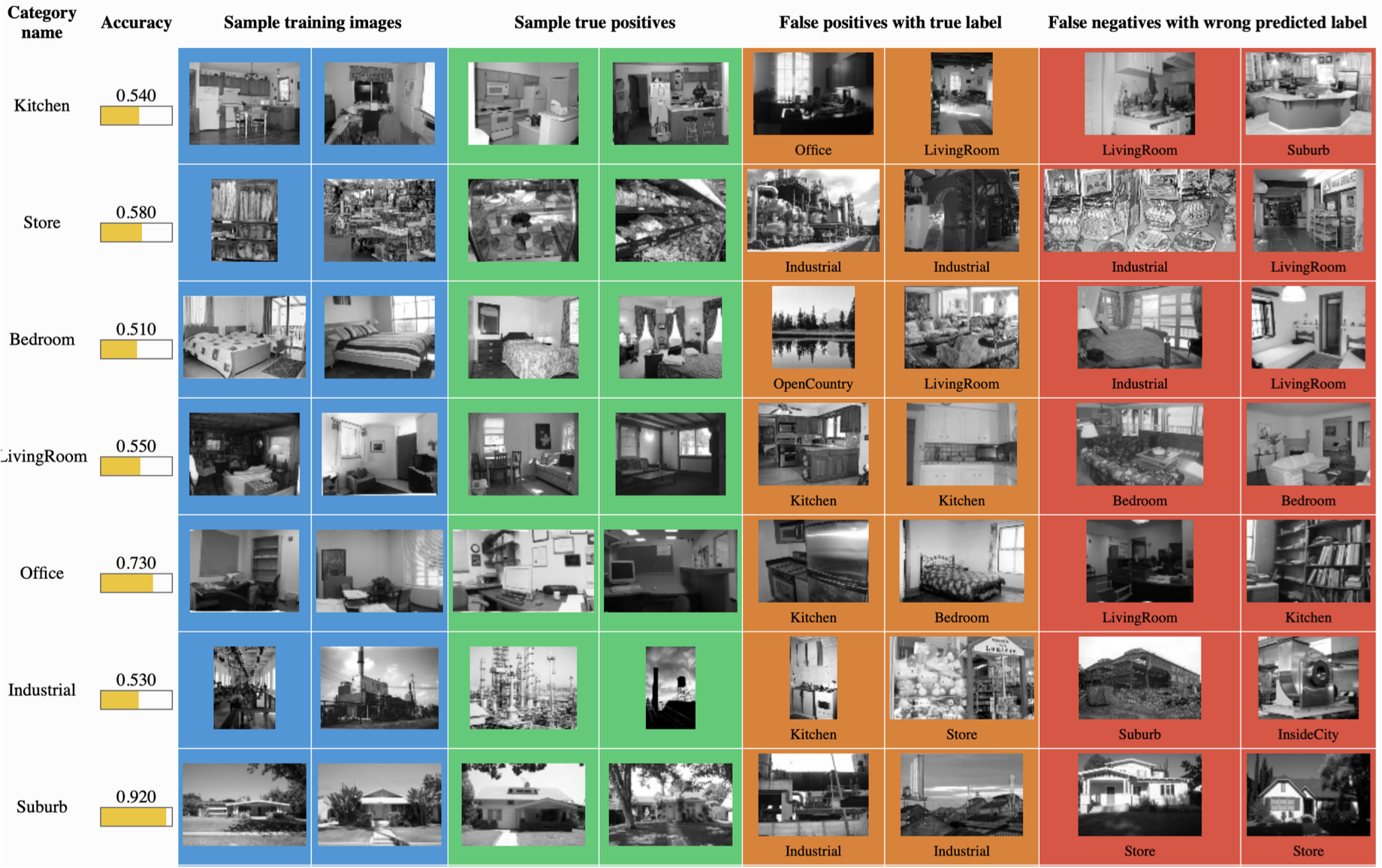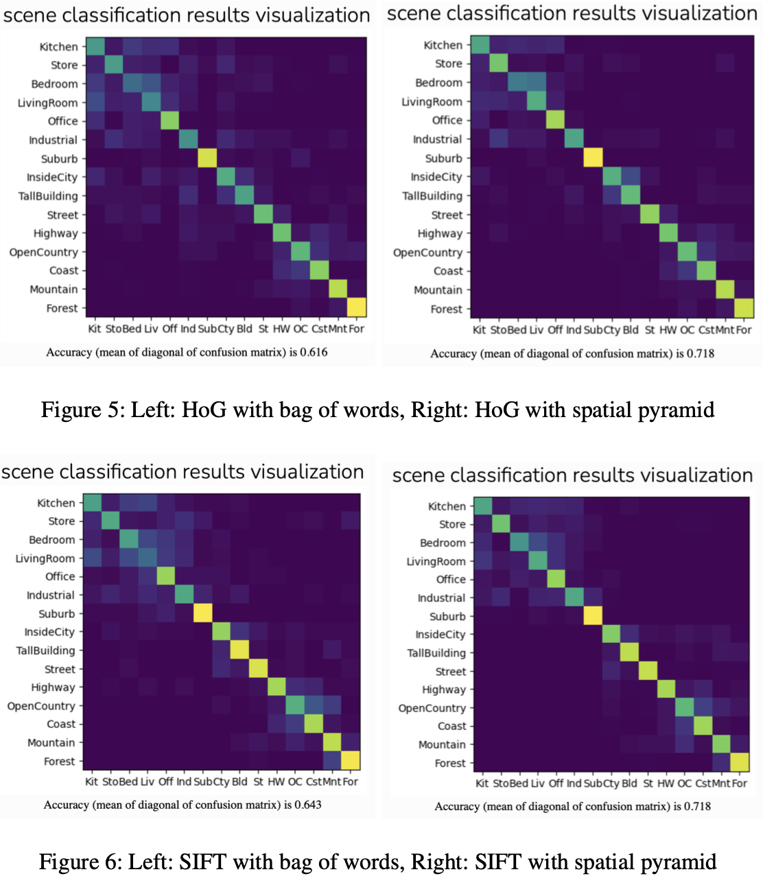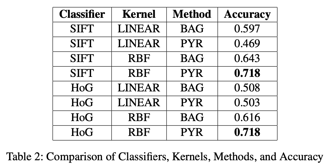 본인이 직접 이미지 classification task를 수행해 본 결과이다. 이미지에서 regular grid method을 사용하여 SIFT와 HoG로 각각 feature extraction을 하였고, K-means clustering으로 visual vocabulary를 만든 후 KNN으로 한개의 이미지 히스토그램을 만들었다. 이 과정을 전체 image dataset에 적용하였고 마지막으로 각각의 히스토그램을 OvA SVM classifier로 분류하였다. SVM 특성상 decision boundary가 linear 하기 때문에 non-linearity를 적용하기 위해 RBF kernel function을 적용하였다.