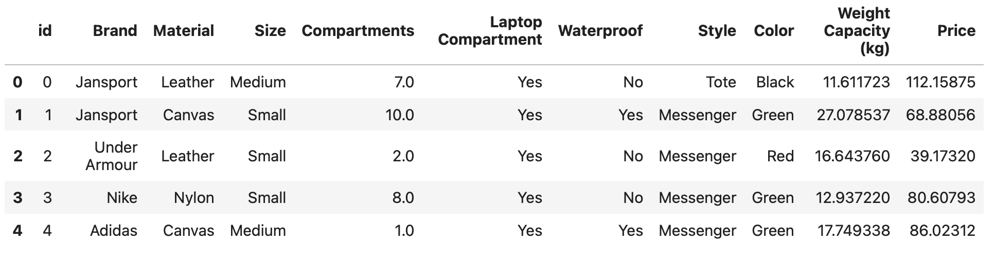 Goal: Predict the price of backpacks given various attributes. Evaluated by RMSE metric.