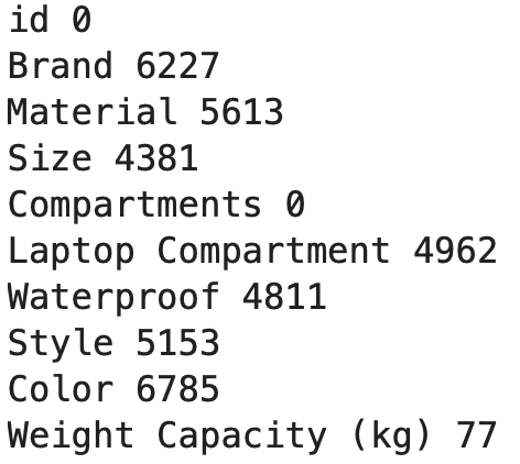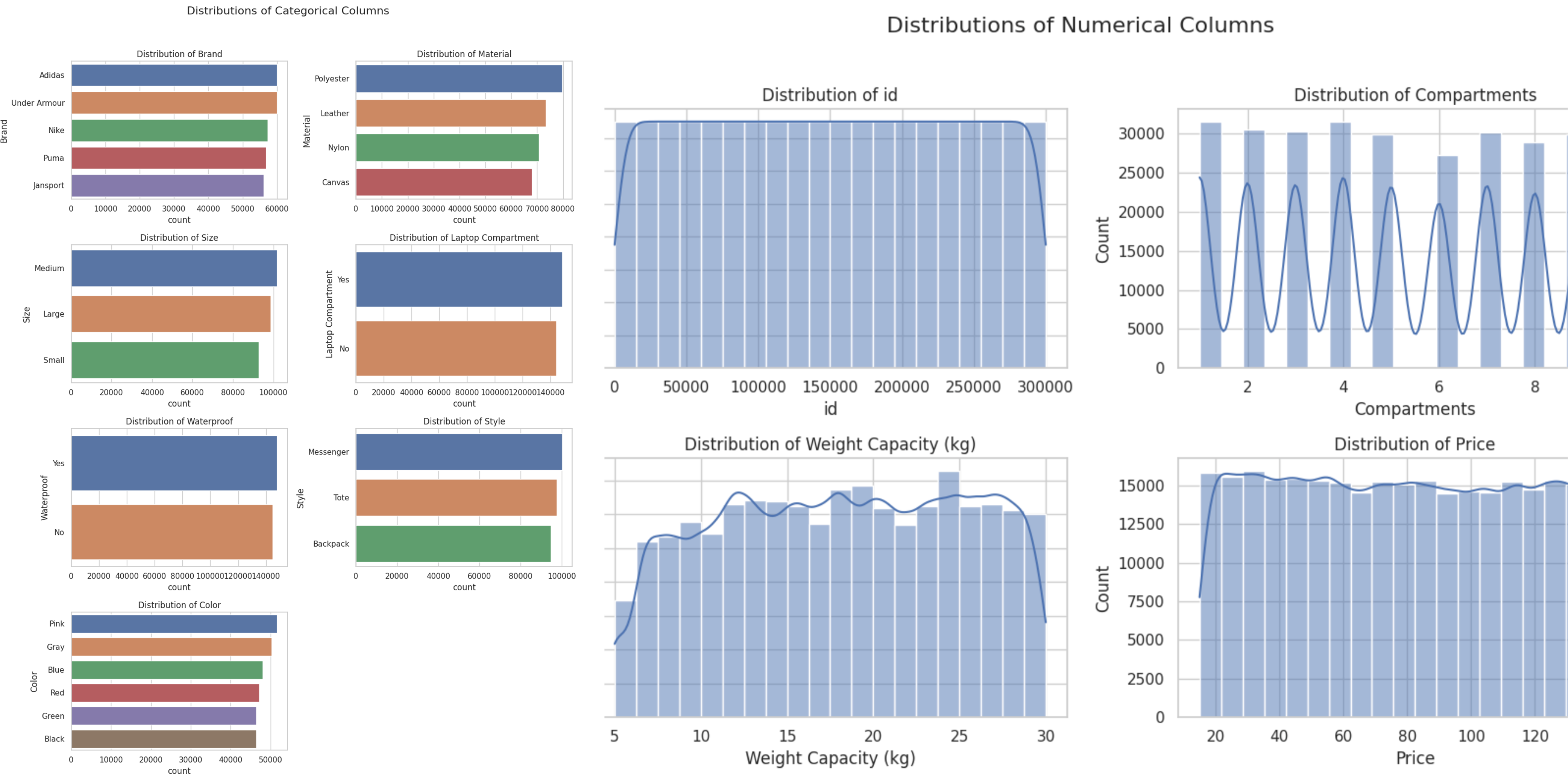There are compartment, capacity, and price as a numerical variables and Brand, Material, Size, Laptop Compartment, Waterproof, Style and Color as a categorical variables. In the analysis below, there are NaN entries for each categorical variables.